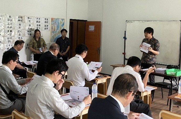 日本国際交流基金作成の日本語教育教科書「いろどり」を使用し、日本語での授業を行っており、2人1組で約3分間自由に会話をするなど実践的な研修を行っている。