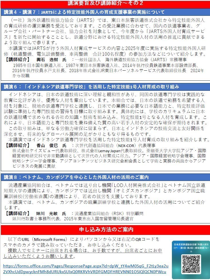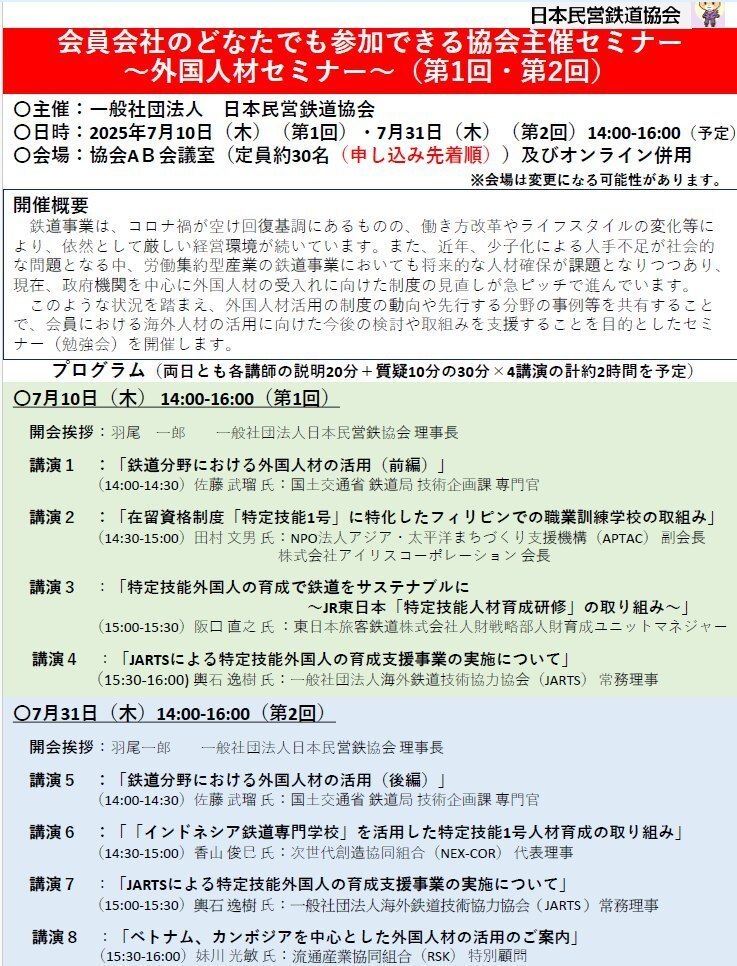 | 2025/07/31 | 一般社団法人 日本民営鉄道協会主催による鉄道業分野に関する「外国人材セミナー第2部」が開催され、「インドネシア鉄道専門学校」を活用した特定技能1号人材の育成・受入に関する取り組みについて、弊組合代表香山代表よりご紹介させて頂きました。 |